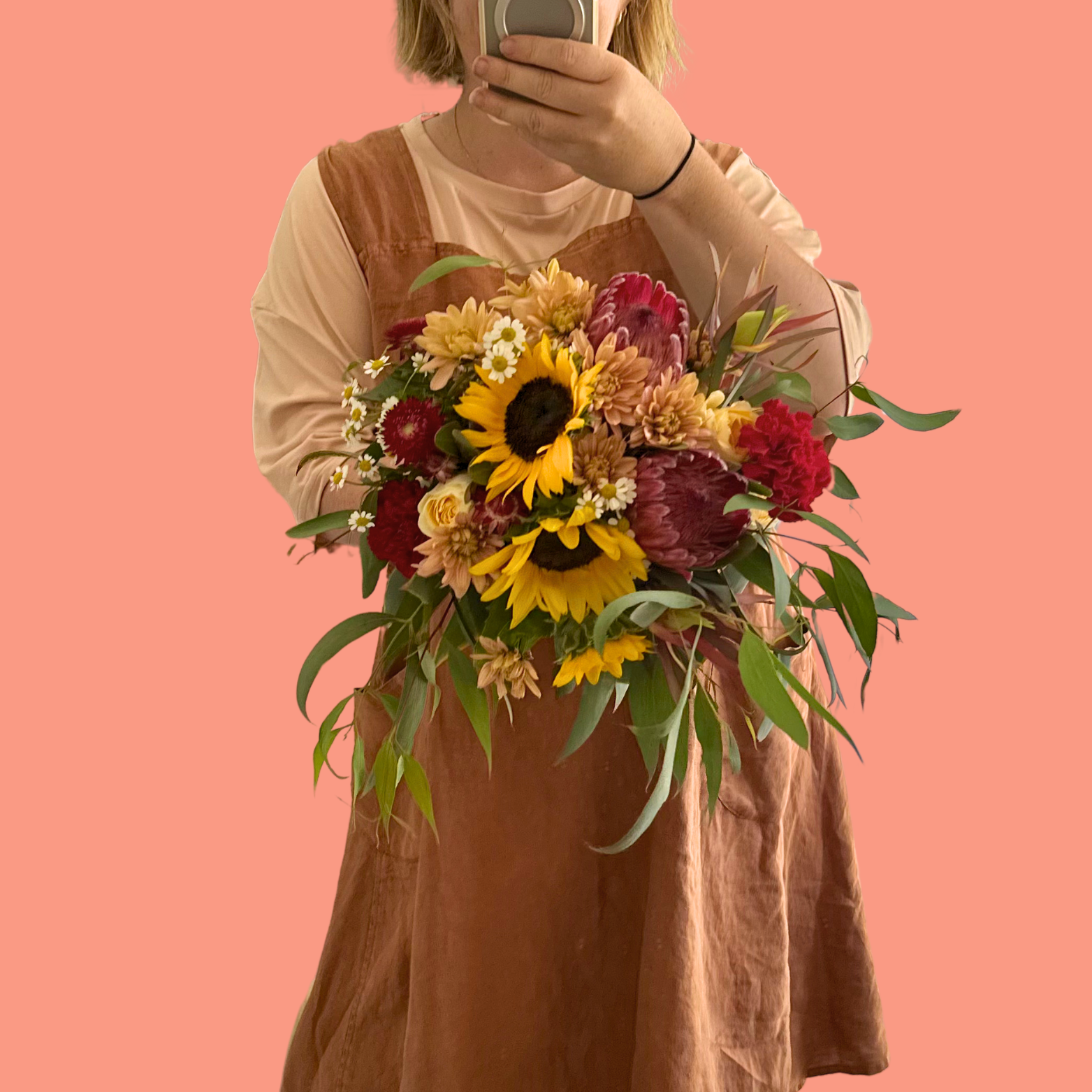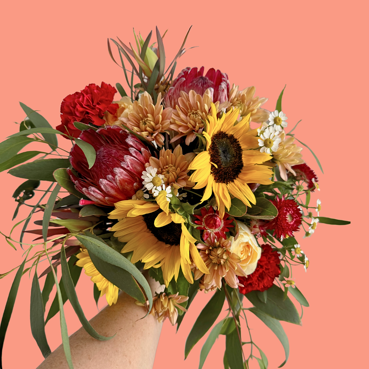 Our Amber flower posy blends the rustic charm of Australian natives with the bright warmth of sunflowers and the sweet simplicity of daisies. It’s a joyful arrangement that feels like golden hour in a bouquet — uplifting, grounded, and just a little bit wild.