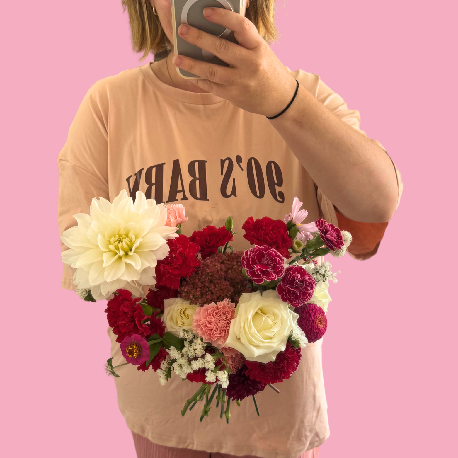 The Bella flower posy is an ode to love in all its passionate forms — featuring lush seasonal roses, rich pinks, deep reds, and pops of soft white. Designed with whatever is blooming in its boldest, most romantic shades, Bella is expressive, confident, and utterly captivating.