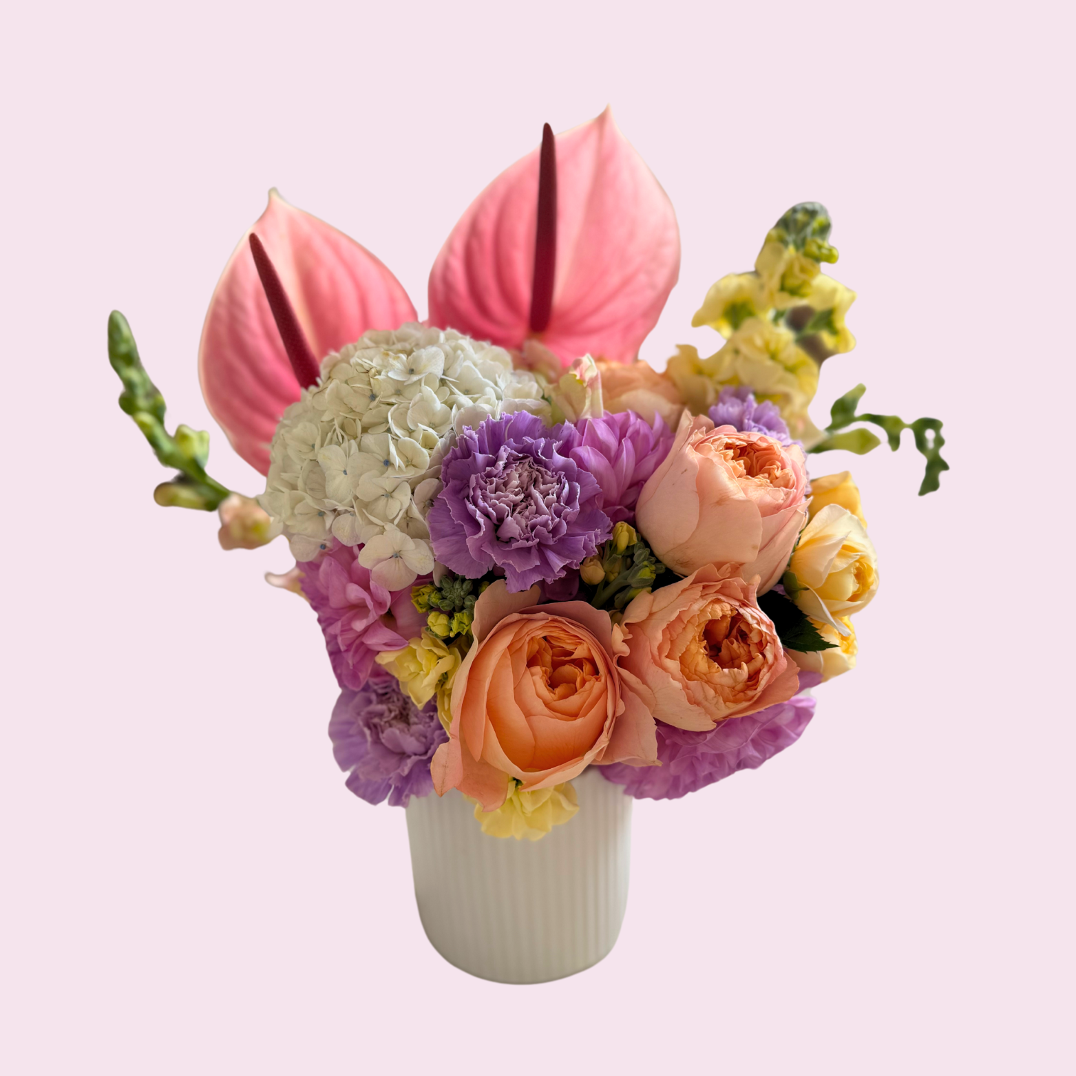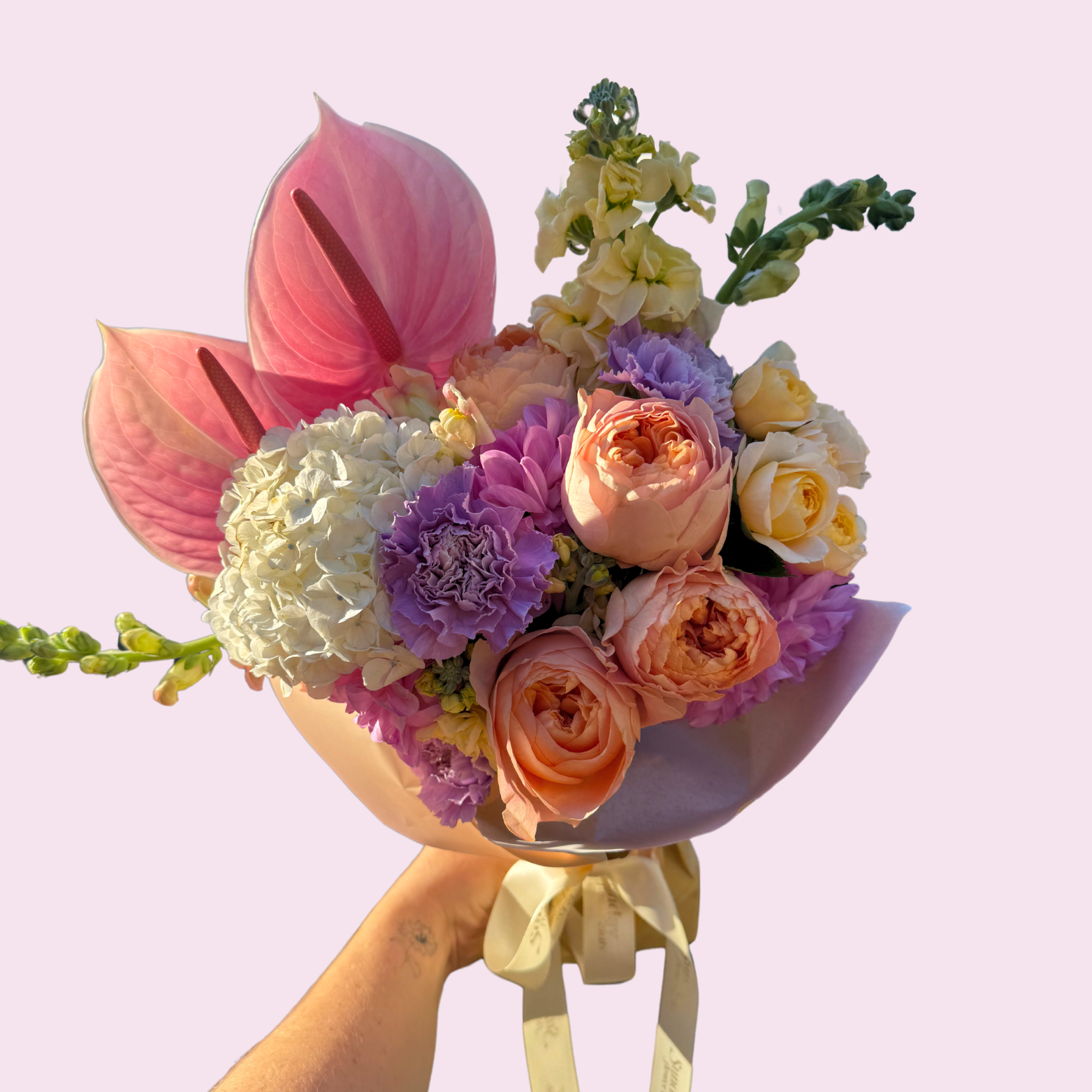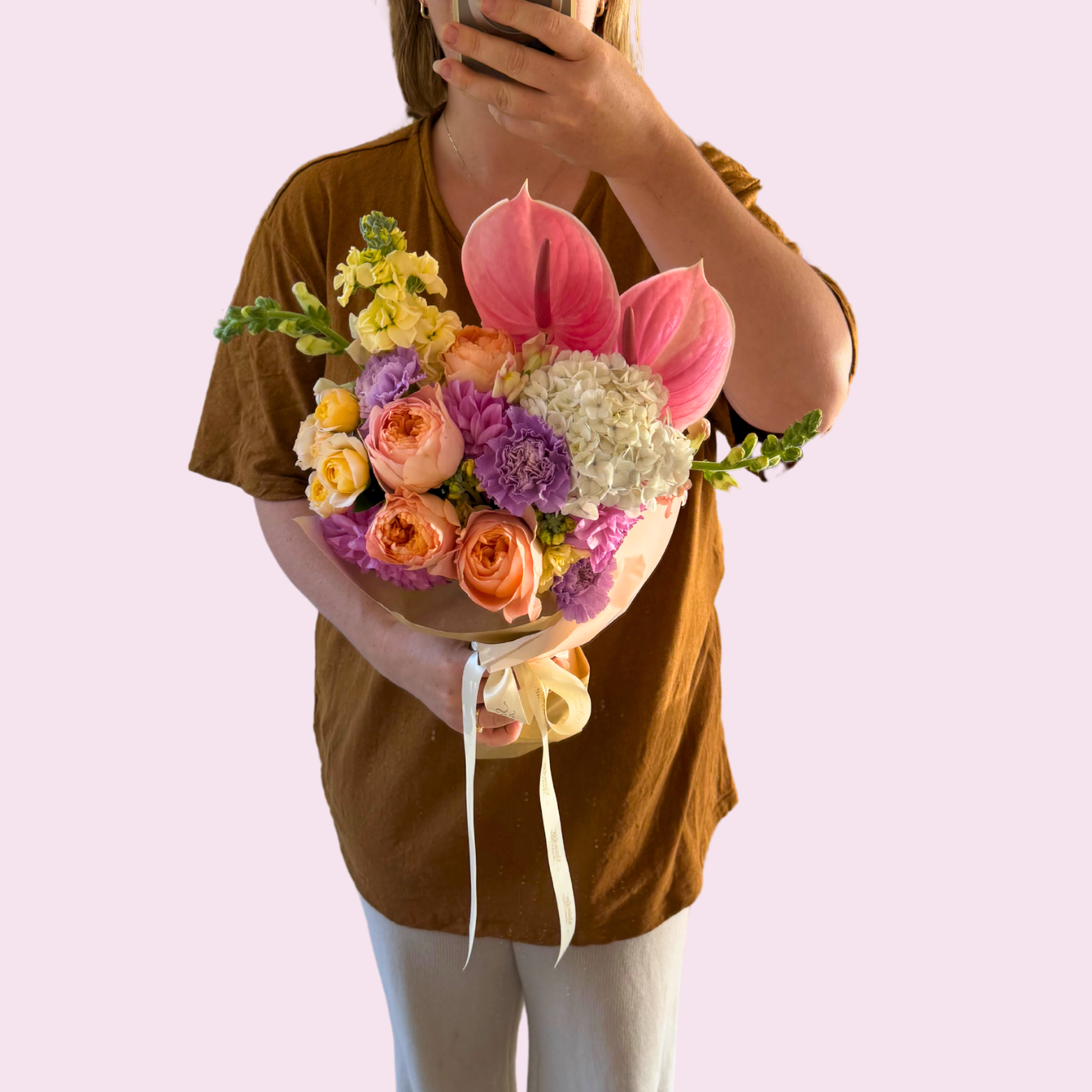 The Florence flower posy is a dreamy mix of soft, rosy tones and delicate pastels — designed to brighten days, lift moods, and add a touch of gentle beauty wherever she goes.
